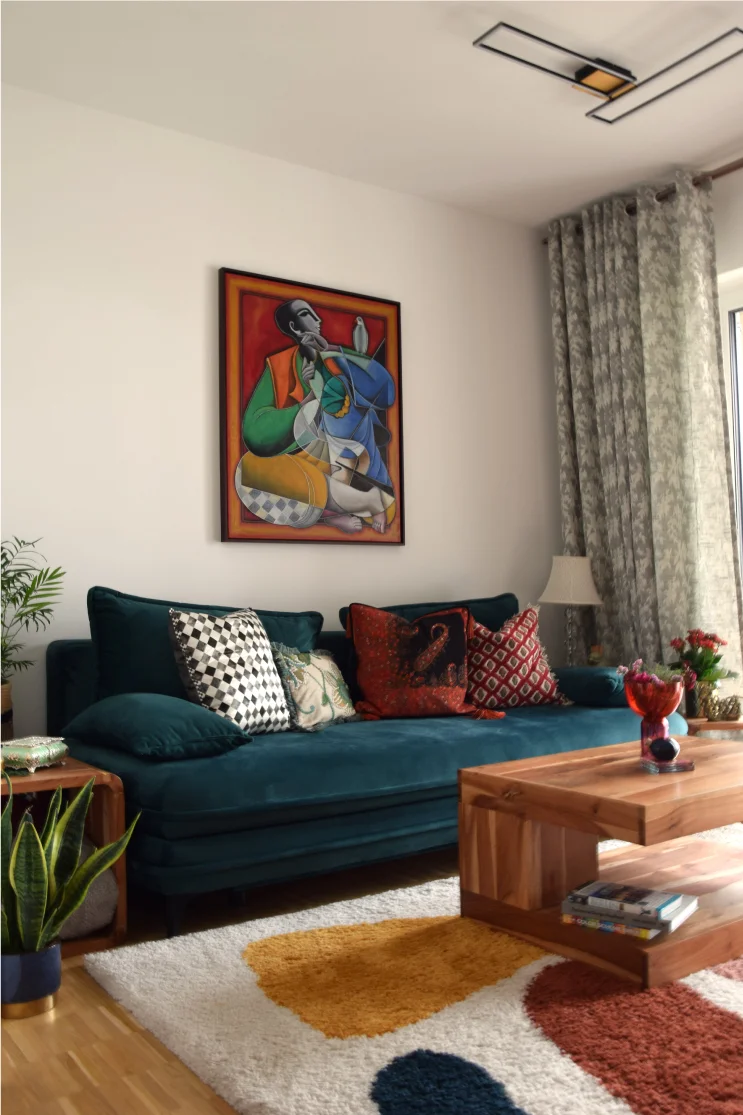 A modern-Indian/eclectic fusion that balances playful vibrancy with sophistication — marrying contemporary European apartment living with Indian-inspired warmth and character.