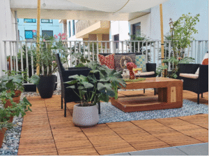 Drawing from minimalist and eclectic styles, this city terrace featuring cozy furniture, natural textures and homegrown plants is transformed into a calming retreat.