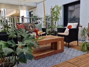 Diese Stadtterrasse ist im minimalistischen und eklektischen Stil gehalten und mit gemütlichen Möbeln, natürlichen Texturen und einheimischen Pflanzen ausgestattet und verwandelt sich in einen beruhigenden Rückzugsort.
